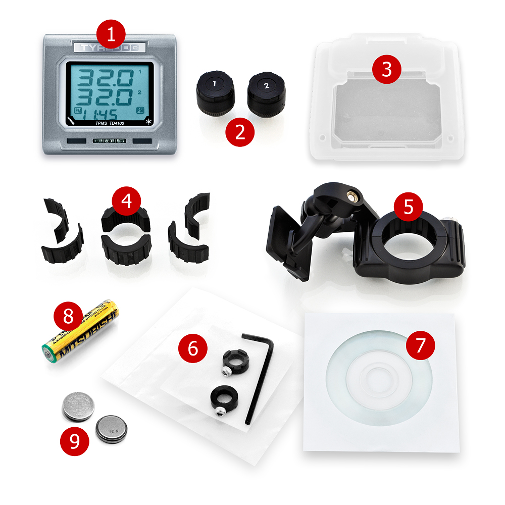 Беспроводные датчики предназначены для накручивания на колесные вентили. Для защиты от не санкционированного скручивания в комплект поставки включены специальные устройства для фиксаций датчиков. Сразу после установки элементов питания каждый датчик начинает работу: измерение давления и температуры и передача данных на приёмное устройство, представляющее собой LCD-дисплей. Полученные данные сразу же отображаются на экране. При выходе показателей за установленные пользователем пределы, система проинформирует при помощи мигания подсветкой дисплея.